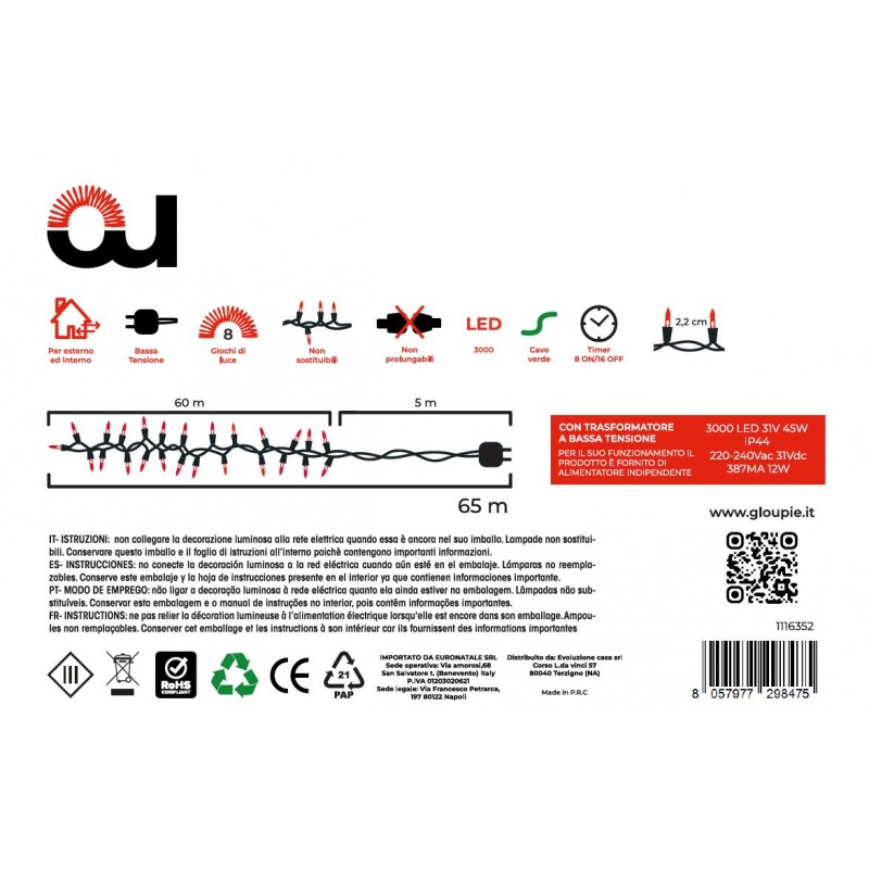 GLOUPIE Luci Di Natale Adatte Sia Ad Un Uso Esterno Che Interno Della Linea Compact 65 Metri (60 Metri Con Luci, 5 Di Solo Cavo Per Un Facile Collegamento Alla Presa Di Corrente Domestica), Con 3000 Led Dalla Colorazione Multicolore 31 V 45 W, Certificazione IP44, Cavo Verde Con Distanza Luci 2,2 Cm E Alimentazione Via Trasformatore A Bassa Tensione 220-240Vac 31Vdc 387MA 12 W, Funzione Memoria Timer 8 Ore On/16 Ore Off, 8 Giochi Luce