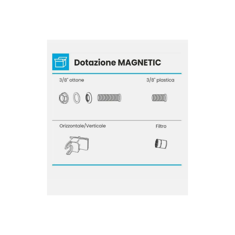 Sono incluse: viti e guarnizioni 3/8" in ottone; vite 3/8" in plastica; supporto orizzontale/verticale e filtro