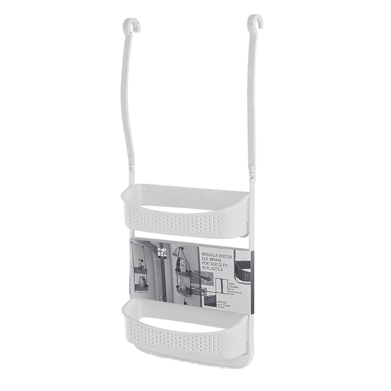 Mensola per doccia porta oggetti 2 ripiani e ganci in plastica Grigia La mensola porta oggetti con 2 ripiani e ganci per l'affissione è l'accessorio ideale per completare gli accessori della doccia nel tuo bagno. La mensola può essere appesa nel box doccia o nella vasca, ha 2 ripiani porta oggetti, ed è utilizzabile anche come portaspugne. Ha 2 ganci superiori che la completano.