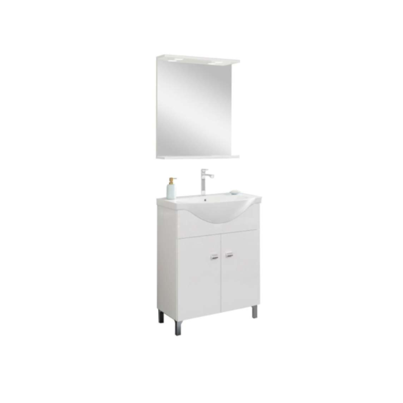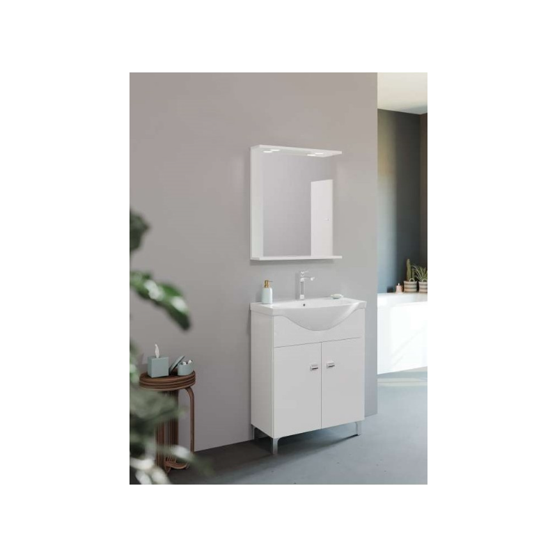 Mobile Bagno A Terra da 65 cm linea Smart Bianco Lucido Completo di Lavabo, Specchiera con Mensola e Illuminazione Led