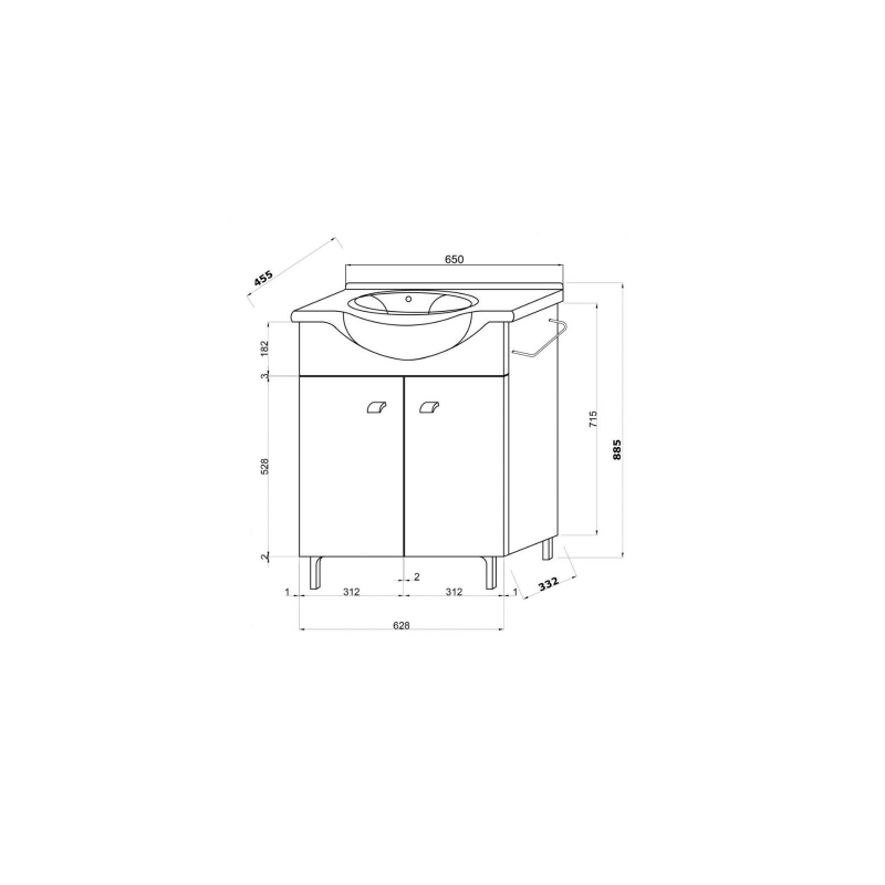 Dimensioni mobile: Lunghezza 65 cm; Larghezza 33,2 cm; Altezza 88,5 cm (comprensiva di piedini)