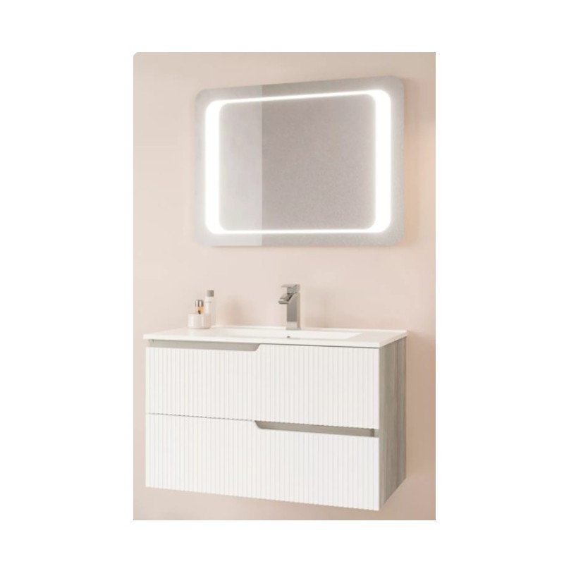 Il set è composto da base sospesa con 2 cassetti capienti, lavabo integrato e specchio con illuminazione LED, per un perfetto equilibrio tra design e praticità.
