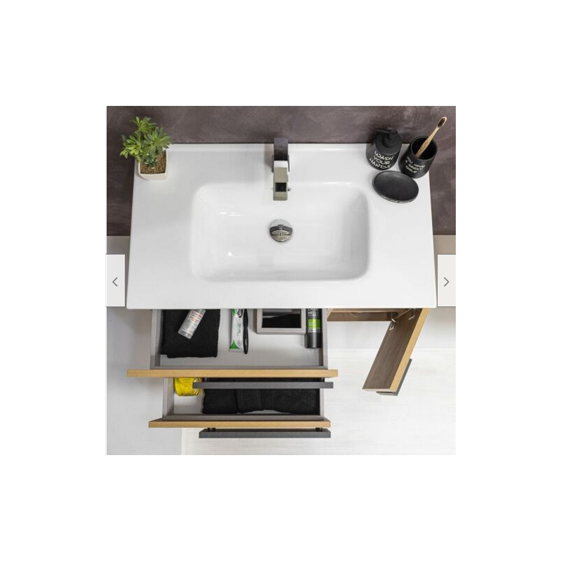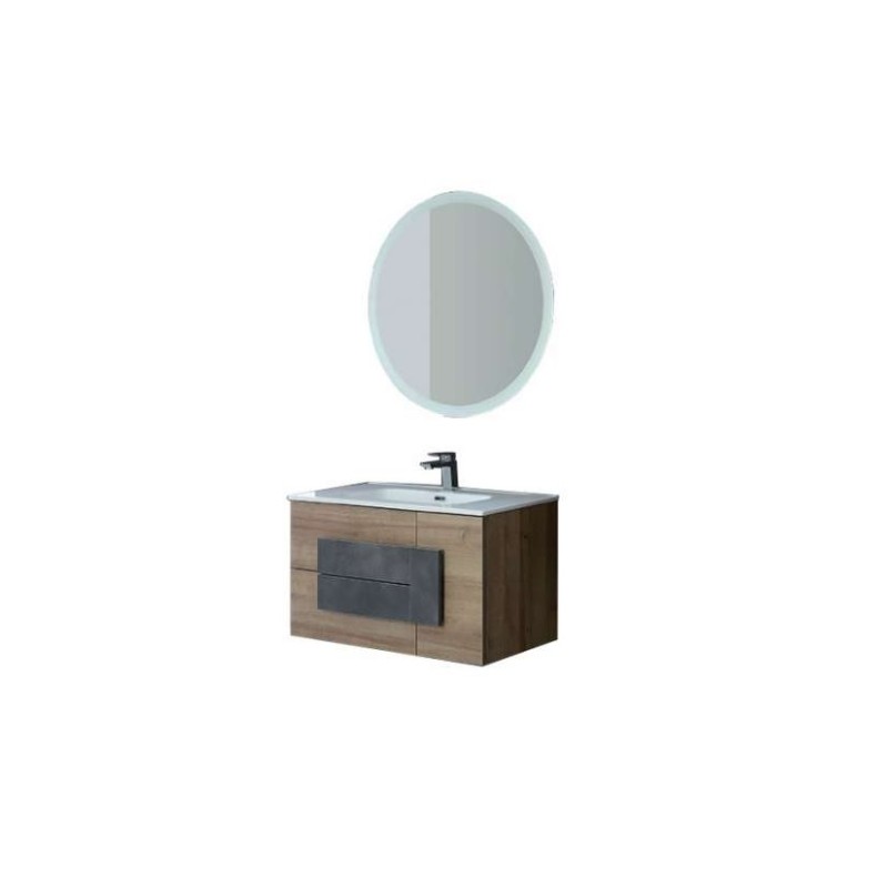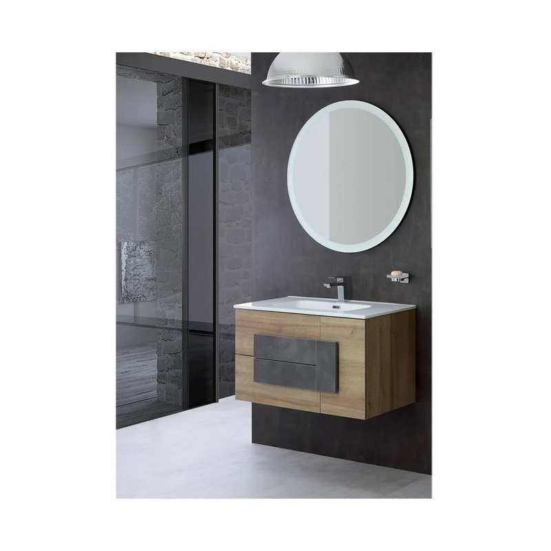 Il mobile bagno Feridras rappresenta la scelta migliore sia in termini di qualità che prezzo; i materiali utilizzati sono di qualità e la realizzazione del prodoto avviente interamente in Italia. La composizione bagno sospesa è realizzata in nobiliato melaminico 18 mm, cassa e frontali sono in color riviera, maniglia effetto pietra, 2 cassetti con chiusura soft-close, consolle in ceramica e specchio tondo su pannello. Misure in cm: L 80 x H 49 x P 47 Specchio: Diam 80 Pz x Ct: 1.