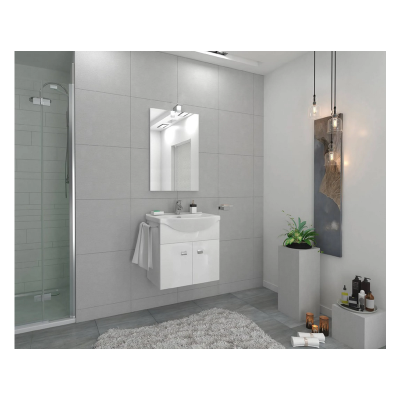 Composizione bagno moderna sospesa composta da base con due ante, con porta-asciugamani, lavabo in ceramica e specchiera con illuminazione alogena. (La mensola non è inclusa, l'immagine è a solo scopo illustrativo).