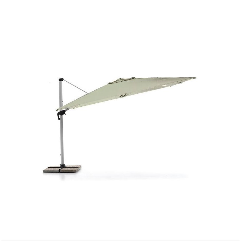 Struttura in alluminio spazzolato. Palo decentrato 100 x 60 mm. 8 stecche 20 x 33 mm. Telo in poliestere con rivestimento in PVC 250 g/m². Parasole con inclinazione multi-posizioni. Sistema di apertura retrattile con manovella. Sistema di rotazione a 360° azionabile con pedale. Base a croce. Dimensioni 400 x 400 cm. Piastrelle non incluse.