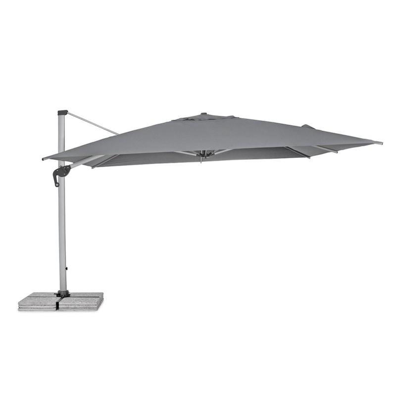 Struttura in alluminio spazzolato. Palo decentrato 100 x 60 mm. 8 stecche 20 x 33 mm. Telo in poliestere con rivestimento in PVC 250 g/m². Parasole con inclinazione multi-posizioni. Sistema di apertura retrattile con manovella. Sistema di rotazione a 360° azionabile con pedale. Base a croce. Dimensioni 400 x 400 cm. Piastrelle non incluse.