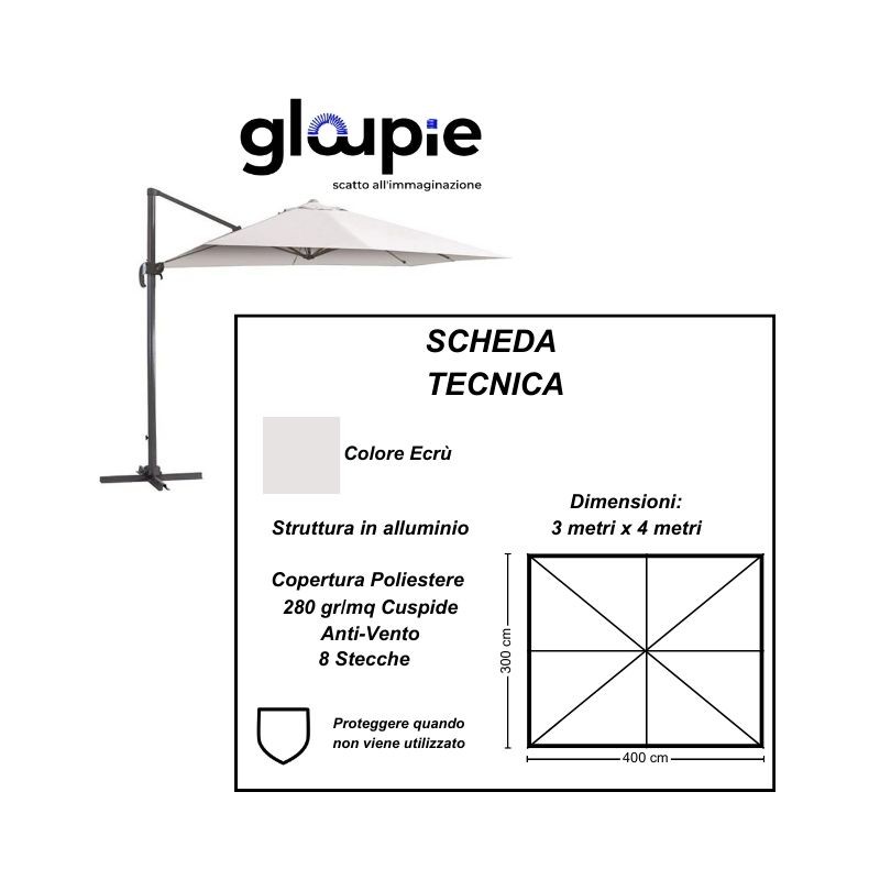 - GLOUPIE Ombrellone Premium Reclinabile a Braccio, Rettagolo 3x4 metri,Ecru, Struttura in Alluminio,Copertura Da 280 Gr/M²
