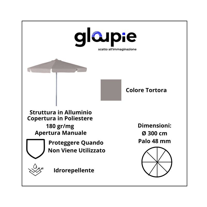 - Gloupie Ombrellone Lixy, Rotondo 3 metri con Palo Centrale da 48 mm,Tortora, Struttura in Alluminio Copertura da 160 Gr/M²,