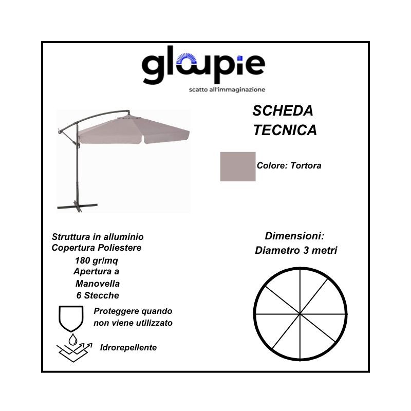 Gloupie Ombrellone Susy Reclinabile a Braccio,Rotondo Diametro 3 metri,Tortora, Struttura in Acciaio,Copertura da 160 Gr/M