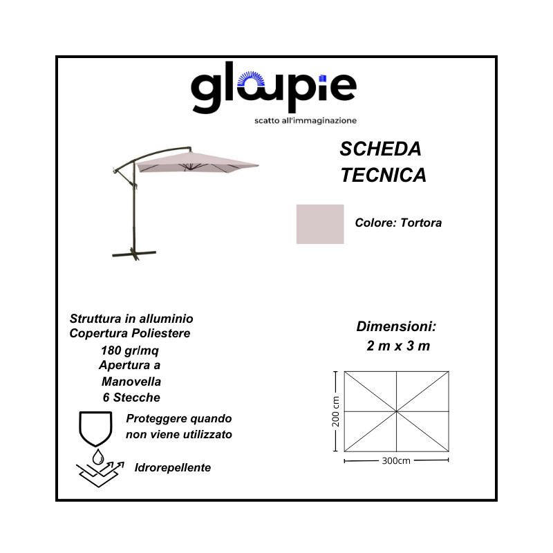 - Gloupie Ombrellone Crilly Reclinabile a Braccio, Rettangolare 2x3 Metri,Tortora, Struttura in Acciaio, Copertura da 160 Gr/M².