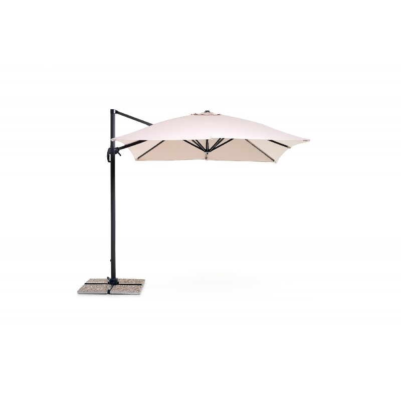 Telo in poliestere con rivestimento in PVC 250 g/m2 di colore Ecrù parasole con inclinazione multi-posizioni, sistema di apertura retrattile con manovella, sistema di rotazione a 360° azionabile con pedale, base a "T" per alloggio piastrelle (non incluse) nella parte posteriore. Dim.: 300x200x270 cm