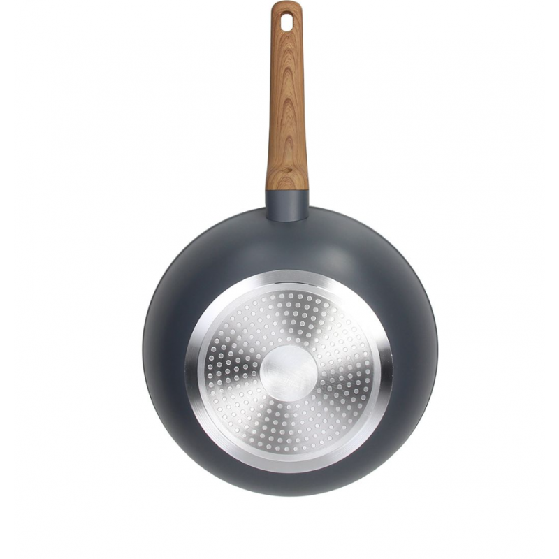 Calore uniforme, cottura impeccabile. Il fondo ad alto spessore garantisce una distribuzione omogenea del calore, mentre il manico con finitura soft touch effetto legno assicura una presa antiscivolo e fresca.