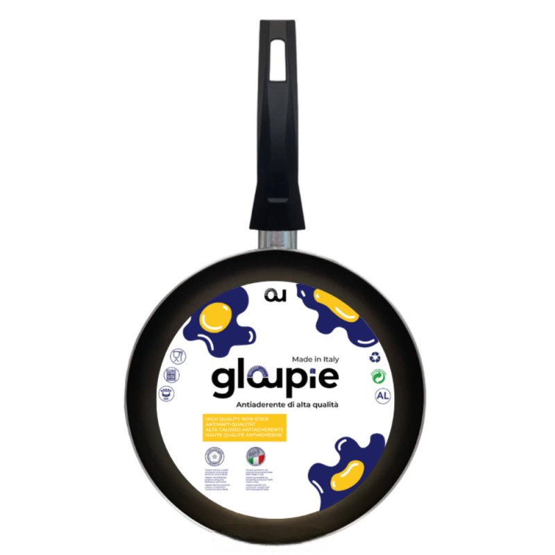 GLOUPIE Padella In Alluminio Con Rivestimento Antiaderente, Antigraffio Di Alta Qualità Ecologico E Riciclabile PFAS, PFOA E Nickel Free, Disponibile In Ben 8 Diversi Diametri Per Ogni Esigenza, Cottura Efficiente, Uniforme E Salutare, Completa Di Manico Ergonomico Con Finitura Soft Touch Nera Per Una Presa Salda E Sicura, Totalmente Made In Italy, Ideale Per Piani Cottura A Gas, E Lavabile A Mano O In Lavastoviglie