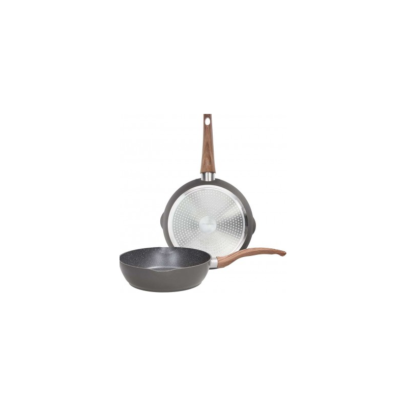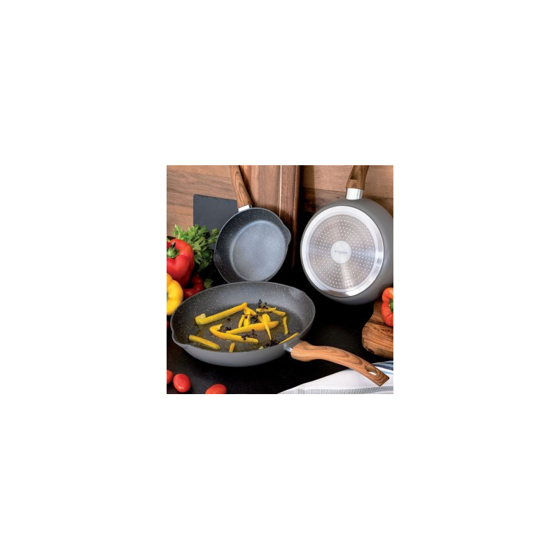 Le padelle, disponibili nei diametri 24 cm e 28 cm, sono adatte a tutti i tipi di piano cottura, inclusa l'induzione. I manici soft touch, con finitura effetto legno, offrono un'impugnatura sicura e confortevole, evitando il rischio di scottature.