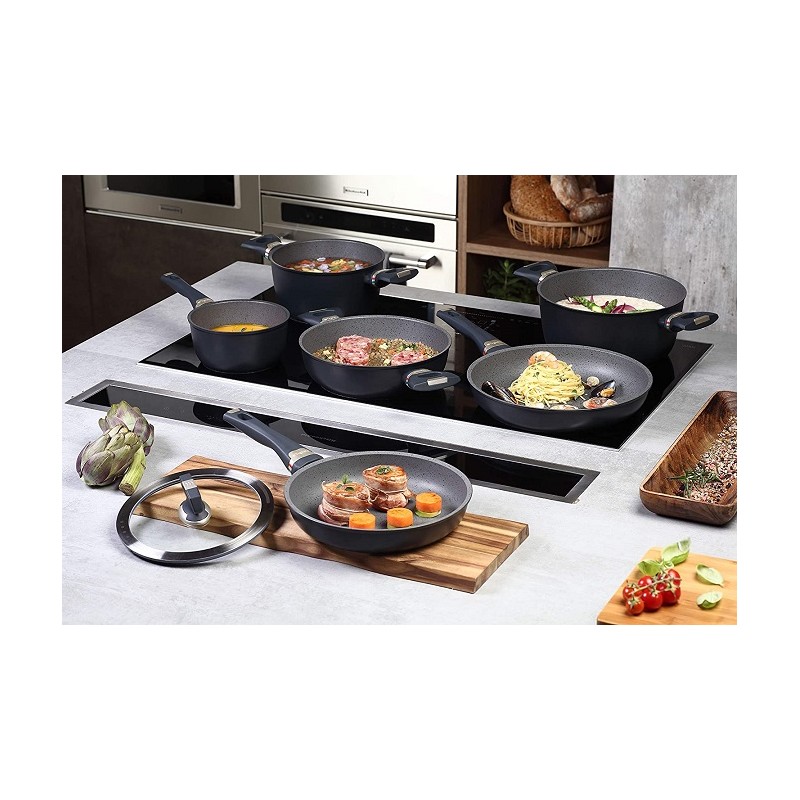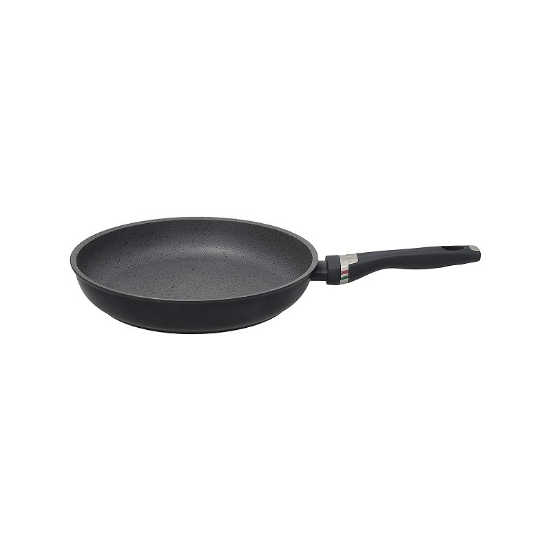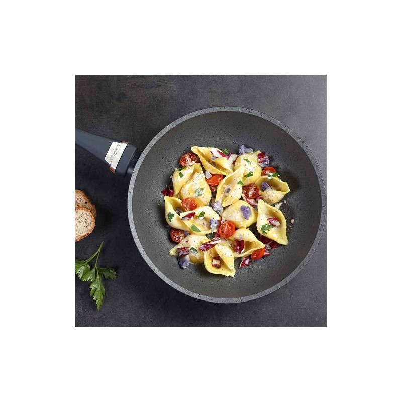 Di colore grigio il corpo della padella è in alluminio forgiato riciclato e antiaderente marmorizzato a 5 strati, che permette quindi un'elevata antiaderenza;