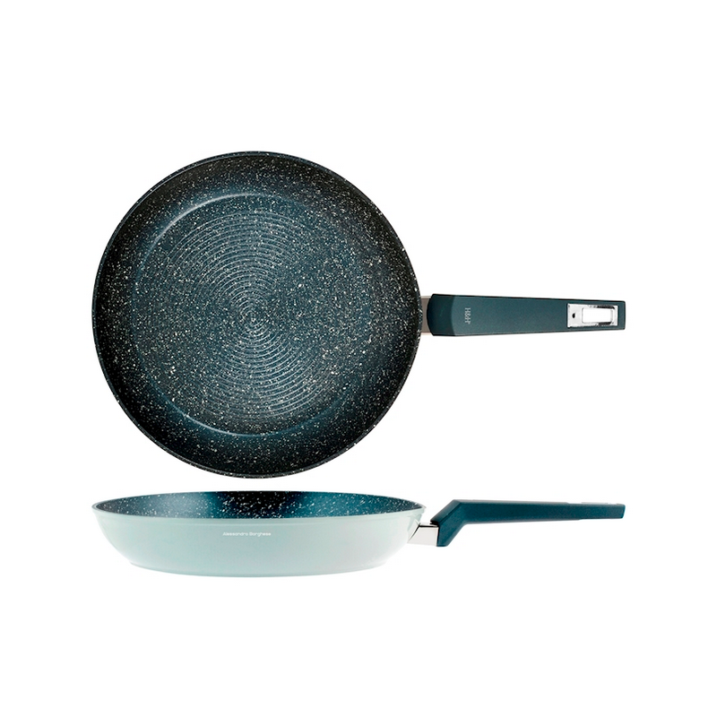Padella linea H&H Gourmet Collection, firmata Alessandro Borghese, realizzata in alluminio coniato, con fondo adatto a tutti i piani di cottura, inclusi vetroceramica ed induzione.
