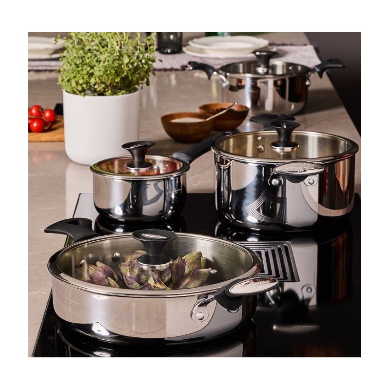 Realizzato in acciaio inox 18/10 di alta qualità, garantisce resistenza, durata nel tempo e massima sicurezza alimentare. Il fondo multistrato termoradiante acciaio/alluminio/acciaio assicura una distribuzione uniforme del calore, permettendo una cottura omogenea e un notevole risparmio energetico.
