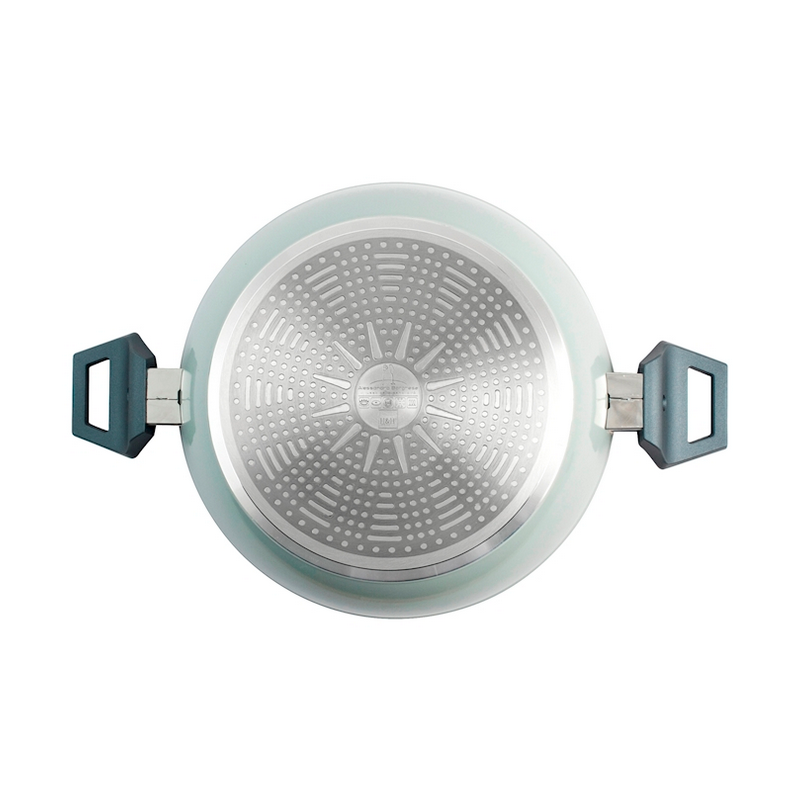 La particolarità del tegame è il fondo con rivestimento antiaderente Pfluon ad effetto spirale 3D e il delicato colore verde chiaro dell'esterno, i due manici effetto soft-touch consentono una presa sicura e anti scottatura.