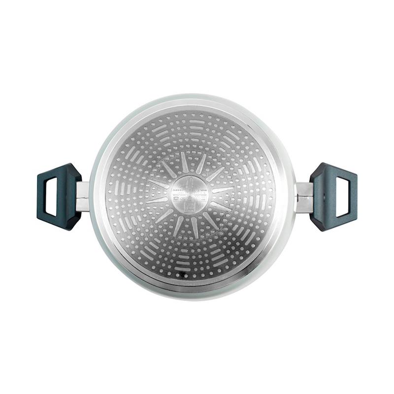 La particolarità del tegame è il fondo con rivestimento antiaderente Pfluon ad effetto spirale 3D e il delicato colore verde chiaro dell'esterno, i due manici effetto soft-touch consentono una presa sicura e anti scottatura.