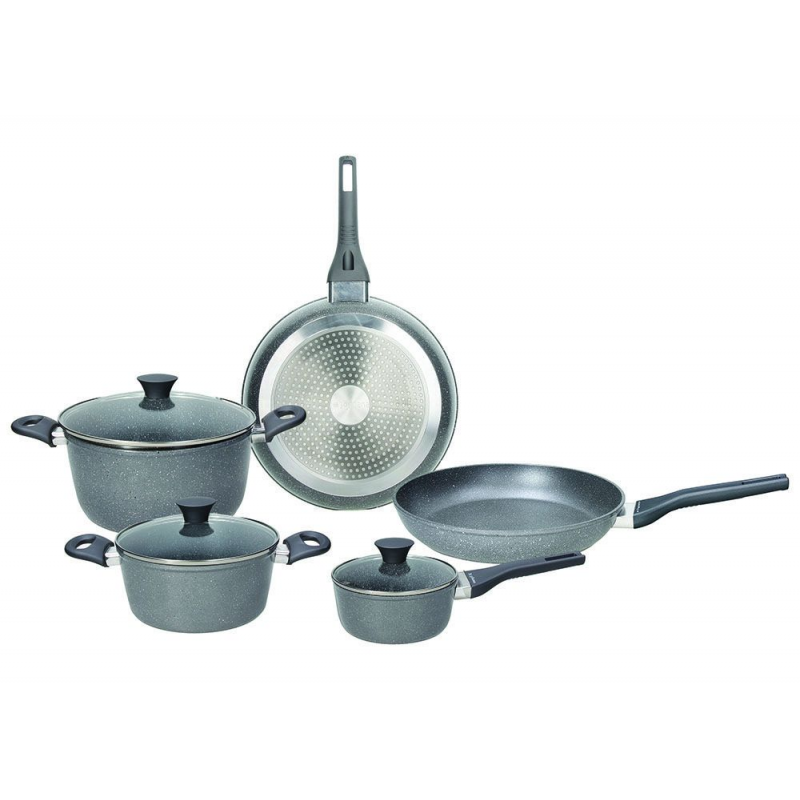 La batteria è composta da 8 pezzi: 3 casseruole di dimensioni diverse (con 1 o 2 manici), 2 padelle (con diamentro di 24 e 28 cm) e 3 coperchi di varie misure e dimensioni.