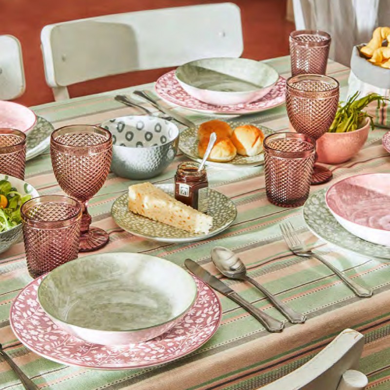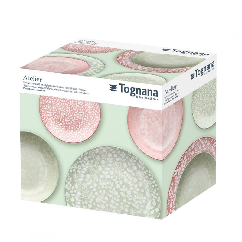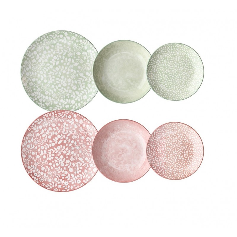 - Il servizio di piatti Madison Atelier da 18 pezzi è realizzato in porcellana colorata in una combinazione di verde pastello e rosa.