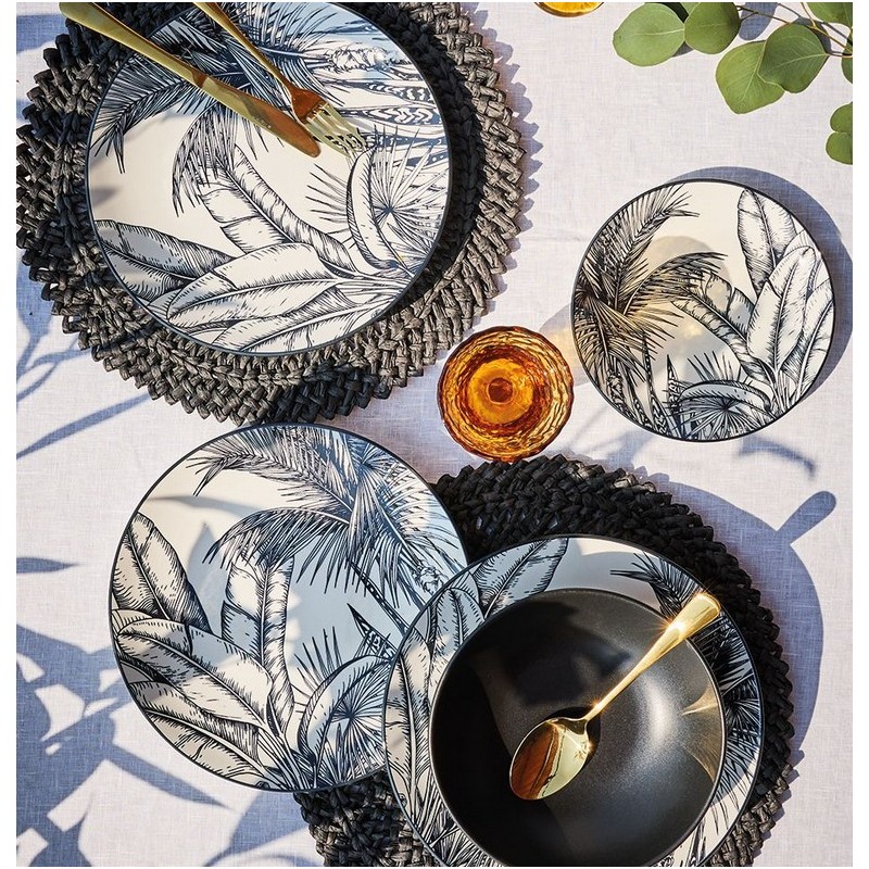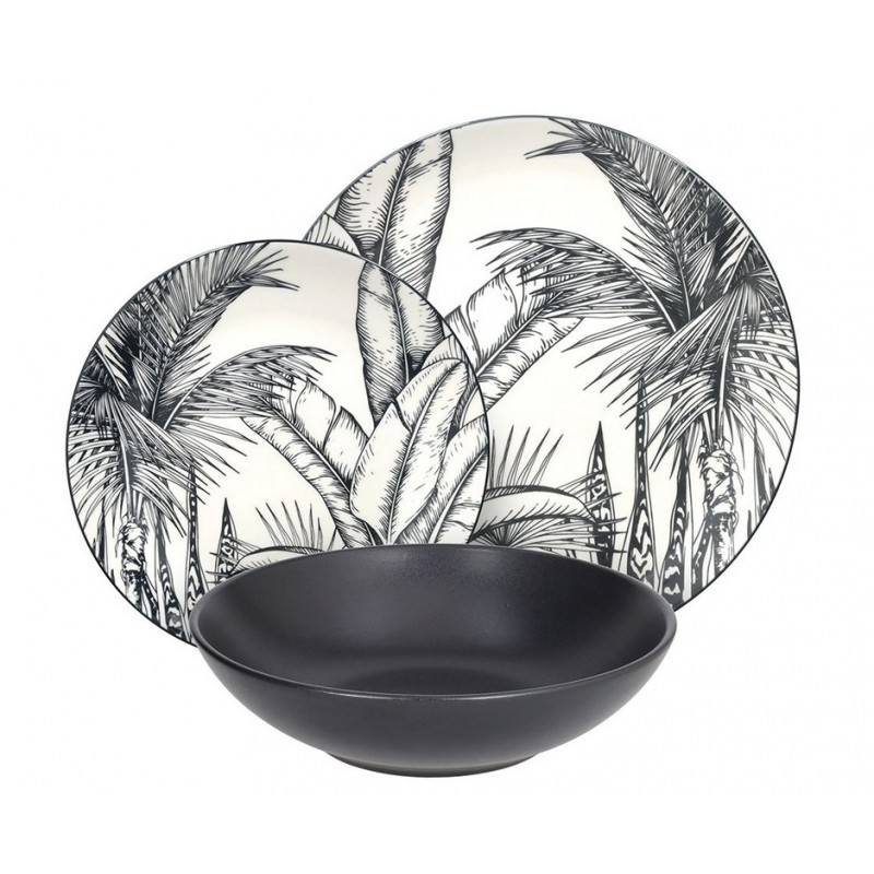 Il servizio piatti Malindi da 18 pezzi, della raffinata Linea Madison, dona un tocco esotico e contemporaneo alla tua tavola. Con un design ispirato alla natura tropicale, unisce decorazioni eleganti in bianco e nero e motivi di palme stilizzate, per un effetto sofisticato e minimalista.
