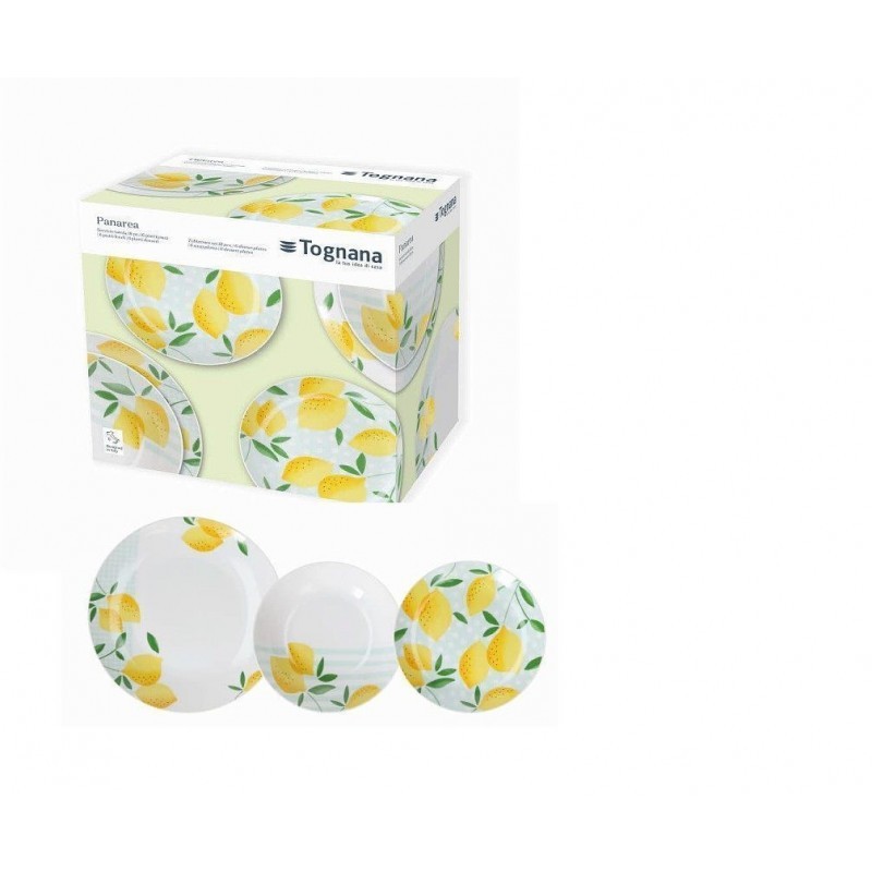 Il limone, con il suo colore giallo e solare, rappresenta l'elemento distintivo per questo servizio piatti in porcellana bianca con decorazioni assortite in azzurro chiaro.