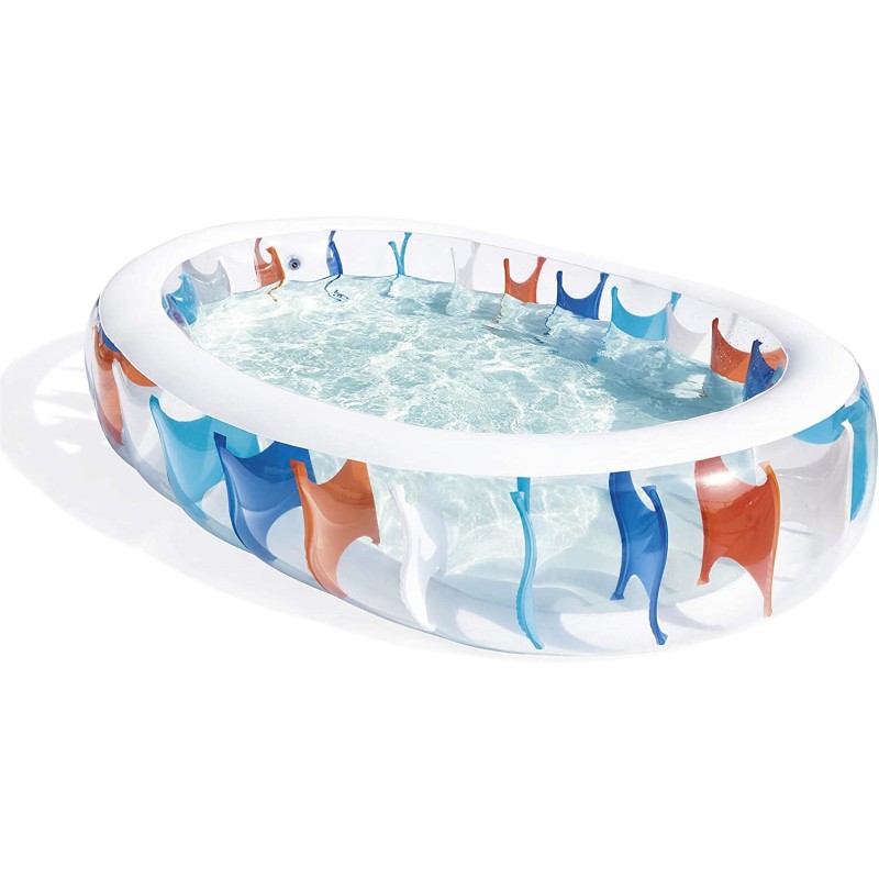colpisce la piscina ovale gonfiabile in vinile trasparente con un colorato motivo ellittico in blu, turchese, arancione e bianco.