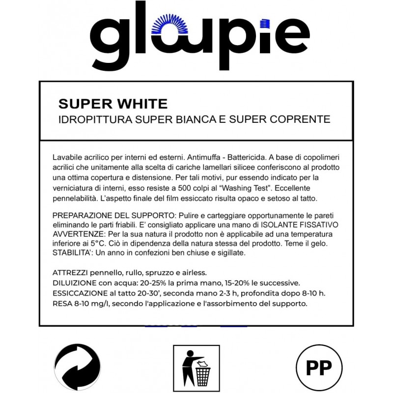 [Qualita' made in italy] : Gloupie super white pittura lavabile acrilica super coprente per le pareti e i muri di tutti gli ambienti interni ed esterni, confezione da 1 litro, interamente prodotta e confezionata in italia con materiali di alta qualità