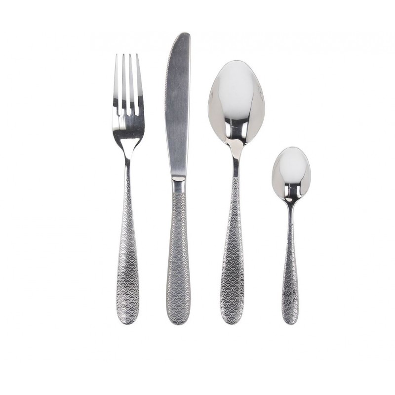 24 pezzi di squisita fattura, realizzati in acciaio inossidabile di altissima qualità, sfilano come un corteo regale per impreziosire la vostra tavola. La finitura argento, lucida e impeccabile, cattura la luce e la riflette in mille bagliori, creando un'atmosfera di eleganza senza tempo.