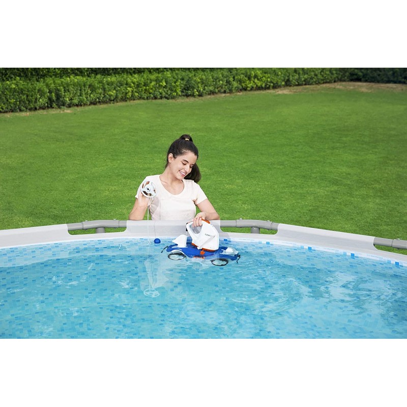 adatto a tutte le piscine fuori terra e interrate con fondale piano, aquatronix della linea flowclear di bestway® pulisce automaticamente il fondale della piscina con la sola pressione di un tasto. con una batteria ricaricabile a litio integrata e un tempo di ricarica di 5-6 ore, il robot aspiratore ha una mobilità illimitata perché non ha cavi e il suo ciclo di pulizia dura 90 minuti. un sensore interno attiva l'aspiratore una volta immerso totalmente e lo disattiva se il livello dell'acqua è insufficiente, proteggendo il motore.perfetto per piscine fino 45m²/ 484ft²portata: 2.700 l/h (710gal./h)velocità di spostamento: 1000 m/h (32,8'/h)