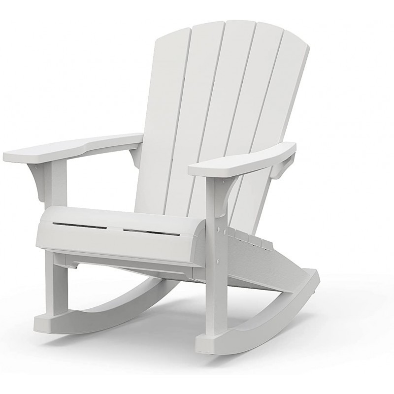 Sedia a dondolo "Rocking" Adirondack K252402 Keter da esterno in resina di dimensioni 80,5x92x100,5 cm nella colorazione bianco: ideale per giardini e cortili esterni, terrazzi e perfino balconi. Vantaggi: Movimento ideale per rilassare il corpo Struttura di materiale di alta qualità Resistente agli agenti atmosferici Mantiene lo stesso colore nel tempo Può essere usata anche senza archi Design caratteristico effetto legno