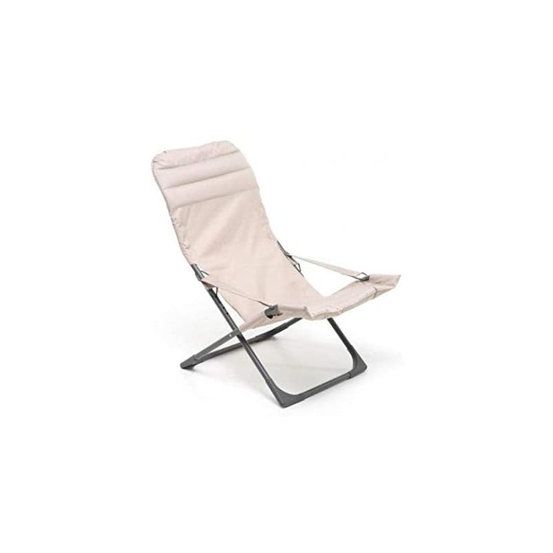 struttura in tubolare di ferro verniciata a polvere epossidica di colore antracite, funzione reclinabile a 3 posizione, telo in oxford di colore tortora, cuscino poggiatesta e poggiapiedi imbottito.