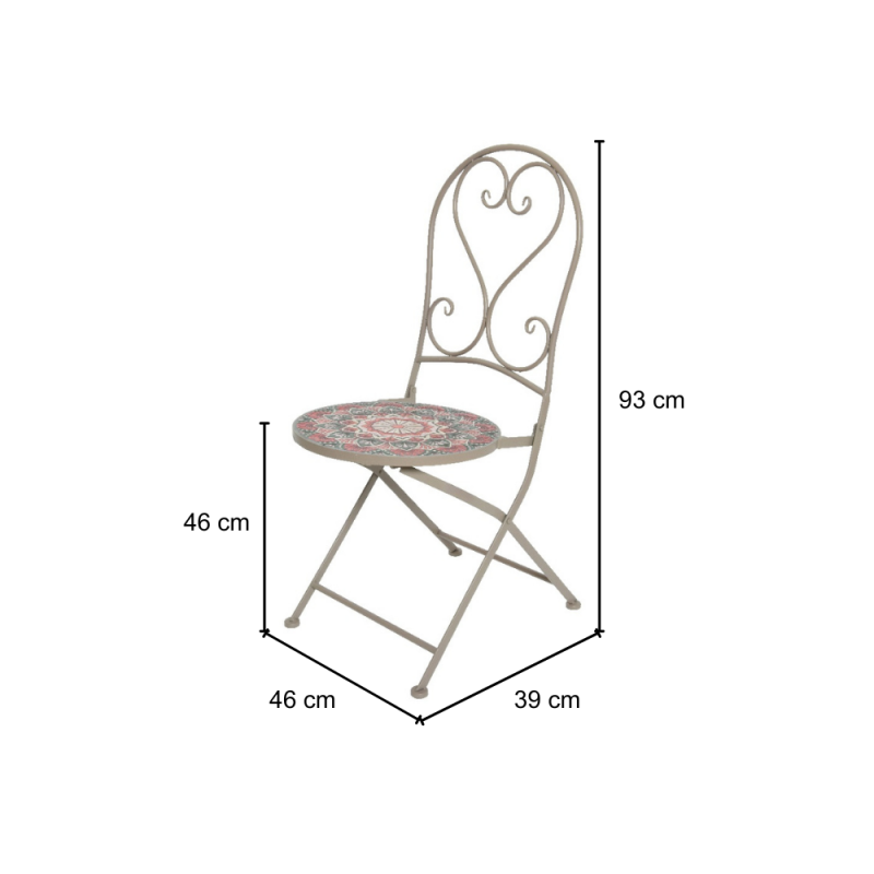 [Qualita' certificata]: Gloupie sedia pieghevole da esterno per giardini, terrazze, patios, balconate in acciaio verniciato a polvere epossidica beige con decorazioni a mosaico floreale linea zante, lunghezza 46 cm x larghezza 39 cm x altezza 93 cm, resistente ai raggi uv, portata massima di 120 kg
