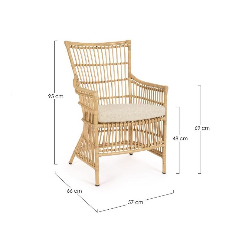 Dimensioni totali: Lunghezza 57 cm; Larghezza 66 cm; Altezza 95 cm; Altezza seduta 48 cm; Altezza dei braccioli 69 cm