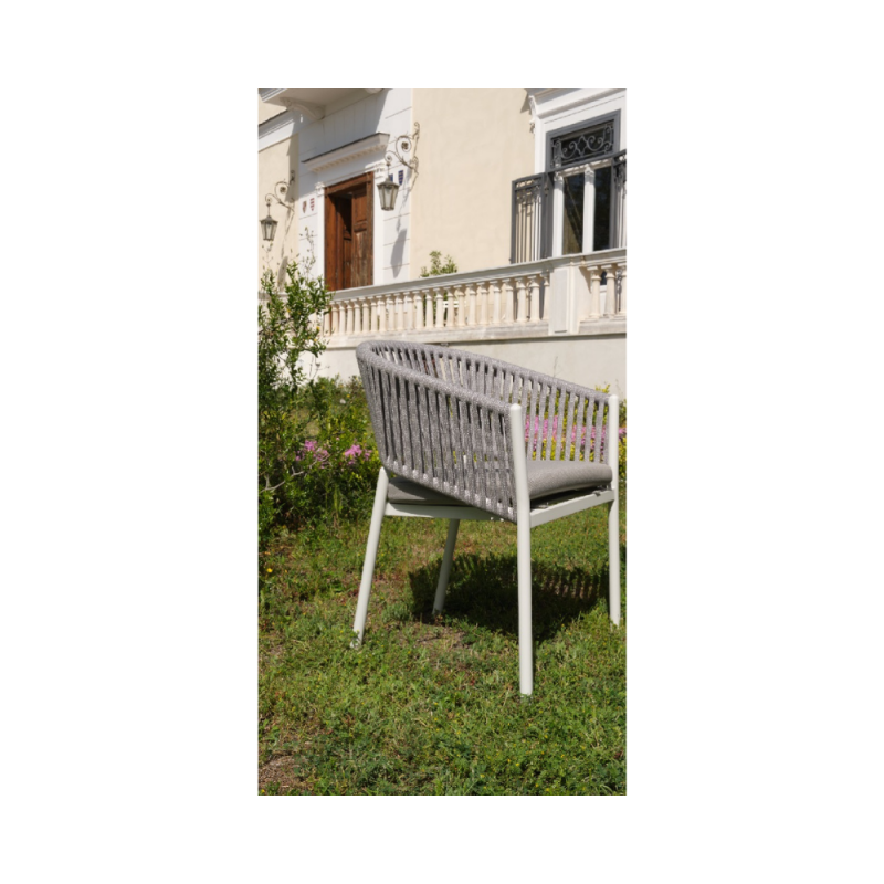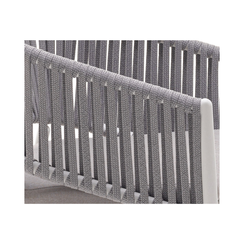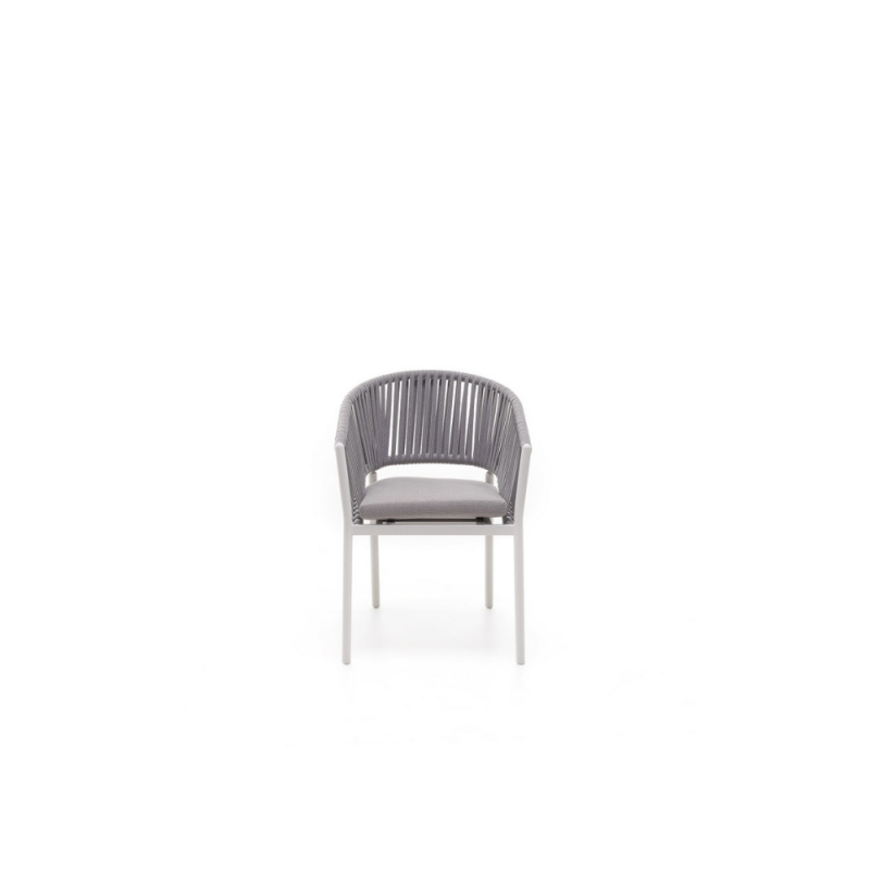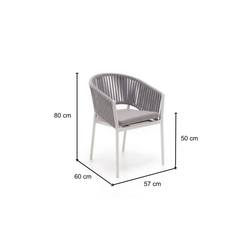 [QUALITA' CERTIFICATA]: KLULK Poltroncina Da Esterno Barbados Con Struttura In Alluminio Verniciato A Polvere Di Poliestere Bianca Resistente Alle Intemperie, Ai Raggi UV, Ai Graffi Ed Agli Urti, Con Intreccio In Corde Di Tetoron 100% Poliestere Dall'Imbottitura In Gomma Polietilene, Completa Di Cuscino Seduta E Schienale Sfoderabile E Lavabile In Tessuto Olefin 100% Polipropilene Anti Ingiallimento E Usura Grigio Chiaro, Lunghezza 57 Cm X Profondità 60 Cm X Altezza 80 Cm