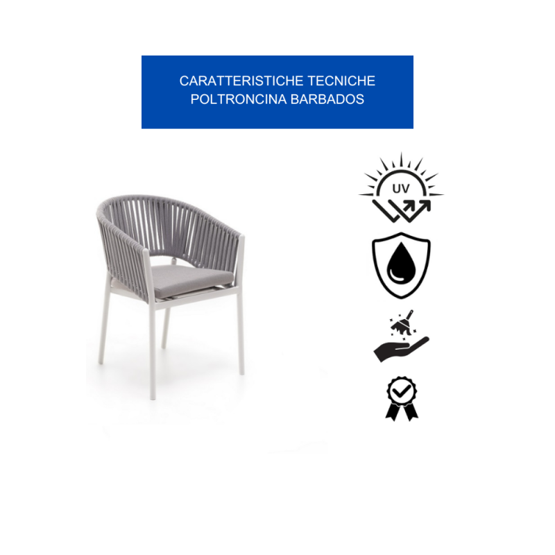 [ROBUSTEZZA FENOMENALE PER UN RELAX DURATURO]: La Poltrona Barbados è Realizzata Con Una Struttura In Alluminio Verniciato A Polvere Di Poliestere Bianca, Resistente A Pioggia, Sole, Graffi E Urti. L'Intreccio In Corde Di Tetoron 100% Poliestere Resistente Alle Intemperie, Si Rivela Morbido E Avvolgente Al Tatto, Garantendo Un Comfort Senza Pari. Completa L'Opera L'Imbottitura In Gomma Polietilene, Che Accarezza Il Corpo E Dona Un'Ulteriore Sensazione Di Morbidezza Per Un Relax Assoluto