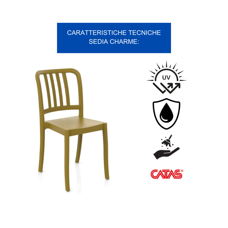 [Design versatile e funzionale]: Dallo stile fine ed elegante, con la possibilità di svariare tra diverse splendide colorazioni, la sedia charme si presta ad arredare con gusto e modernità qualsiasi ambiente, interno o esterno. Che si tratti del tuo giardino, terrazzo, balcone, cucina, bar o ristorante, si integrerà perfettamente donando un tocco di raffinatezza. Compatta, e' ideale anche per spazi ridotti, mentre la possibilità di impilarla facilita lo stoccaggio e il trasporto