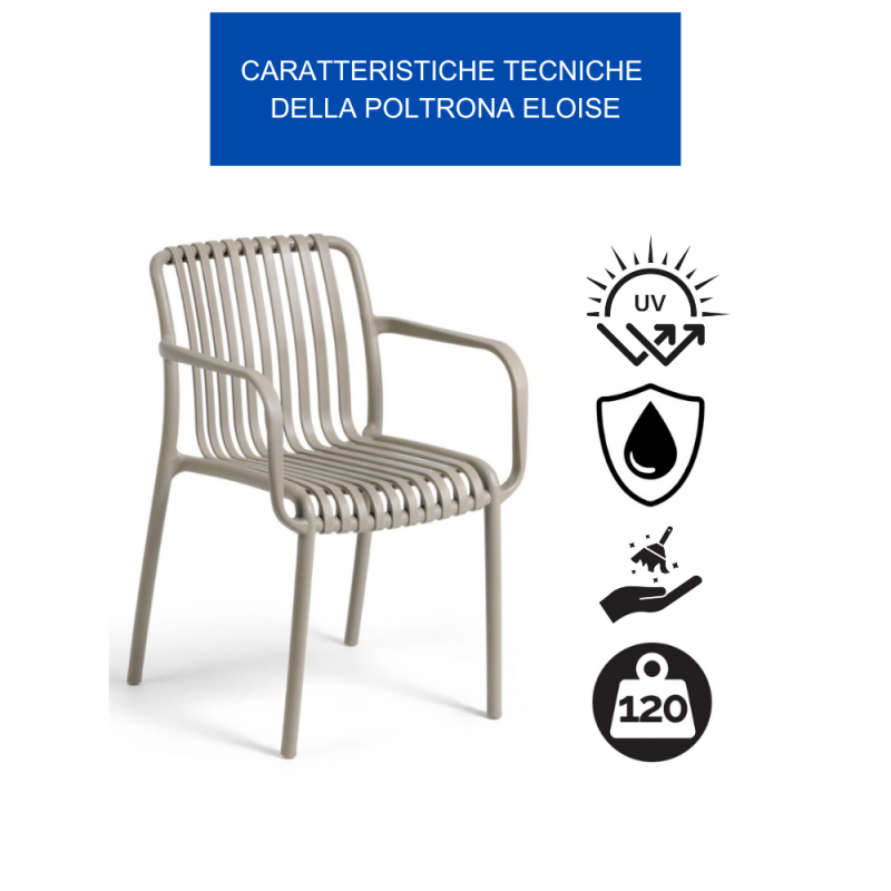 [Resistenza e durata massima]: Realizzate in polipropilene di alta qualità, queste poltrone sono in grado di resistere a qualsiasi sollecitazione e alle intemperie. Non dovrai temere né i raggi uv del sole né le piogge torrenziali: le poltrone eloise rimarranno intatte nel tempo, conservando la loro bellezza e la loro funzionalità. Dimentica le poltrone che si scoloriscono o si rompono dopo pochi mesi di utilizzo: con le eloise potrai godere di un prodotto affidabile e duraturo