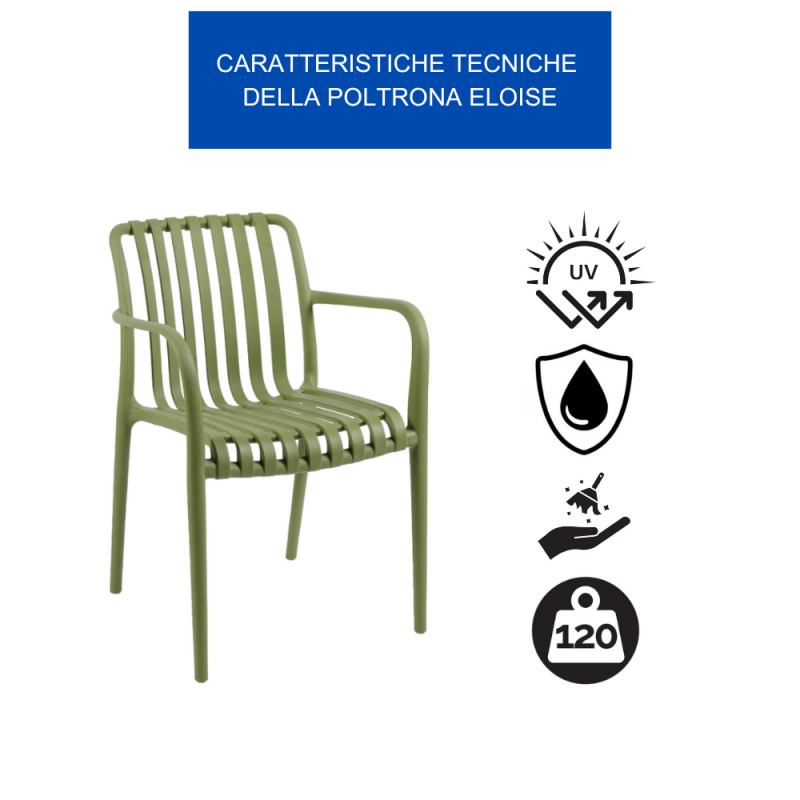 [Resistenza e durata massima]: Realizzate in polipropilene di alta qualità, queste poltrone sono in grado di resistere a qualsiasi sollecitazione e alle intemperie. Non dovrai temere né i raggi uv del sole né le piogge torrenziali: le poltrone eloise rimarranno intatte nel tempo, conservando la loro bellezza e la loro funzionalità. Dimentica le poltrone che si scoloriscono o si rompono dopo pochi mesi di utilizzo: con le eloise potrai godere di un prodotto affidabile e duraturo