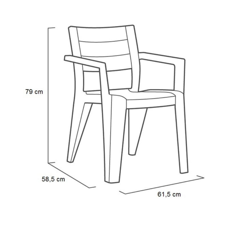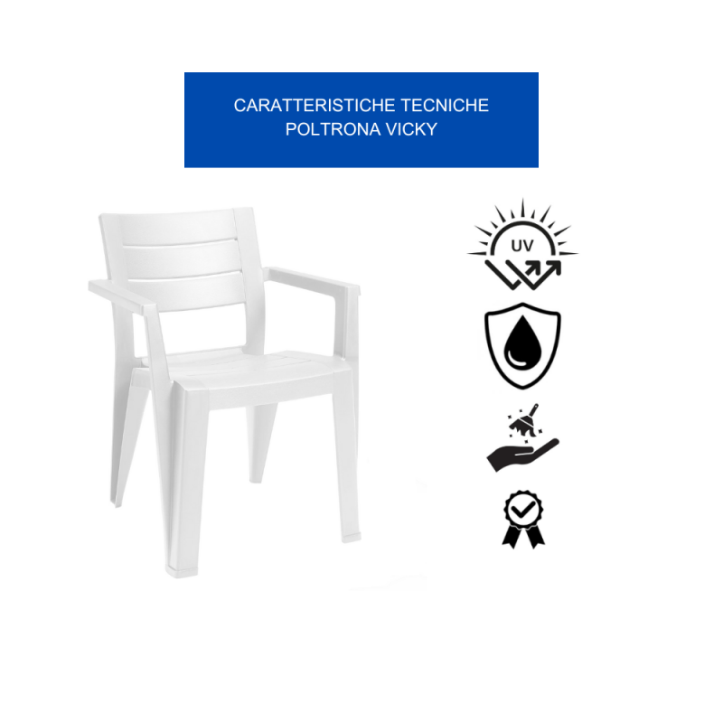 La Poltrona Vicky Oltre Ad Avere Delle Dimensioni Compatte di Lunghezza 61,5 x Profondità 58,5 x Altezza 79 cm è Impilabile, Per Un Facile Rimessaggio Quando Non In Uso, E La Sua Struttura Robusta La Rende Adatta Anche Ad Un Uso Contract In Bar, Ristoranti E Locali All'Aperto. La Poltrona è Disponibile In Diverse Colorazioni Per Adattarsi Perfettamente A Qualsiasi Stile Di Arredamento Esterno, Dal Classico Al Moderno, Dal Minimal Al Rustico