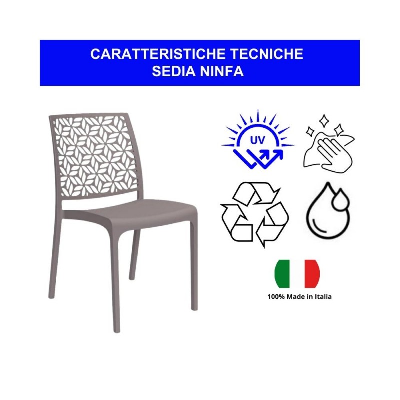 [DESIGN VERSATILE E FUNZIONALE]: La sedia Ninfa, elegante e raffinata, si distingue per lo schienale lavorato a forma di ninfee, un dettaglio ispirato alla natura che ne esalta il carattere e la bellezza senza tempo. Perfetta per spazi moderni e sofisticati, unisce tradizione e design contemporaneo. Adatta sia per esterni che interni, è compatta e impilabile, rendendola pratica oltre che elegante. Ideale per giardini, ristoranti o ambienti domestici, Ninfa dona a ogni spazio un tocco di classe e comfort.