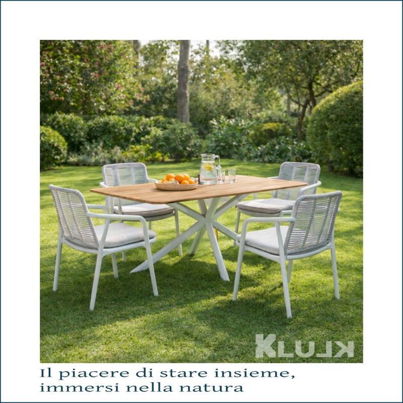 [QUALITÀ CERTIFICATA]: KLULK Set 4 poltrone Nassau da esterno con struttura in alluminio verniciato a polvere, resistente a intemperie e raggi UV. Schienale in poliacrilico e intreccio in corde di Tetoron per solidità ed eleganza. Il cuscino di seduta è realizzato in tessuto Olefin (100% polipropilene) , idrorepellente, sfoderabile e lavabile, con imbottitura Quick Dry Foam garantisce un elevato comfort e un’asciugatura rapida Dimensioni: 65×60×81,5 cm.