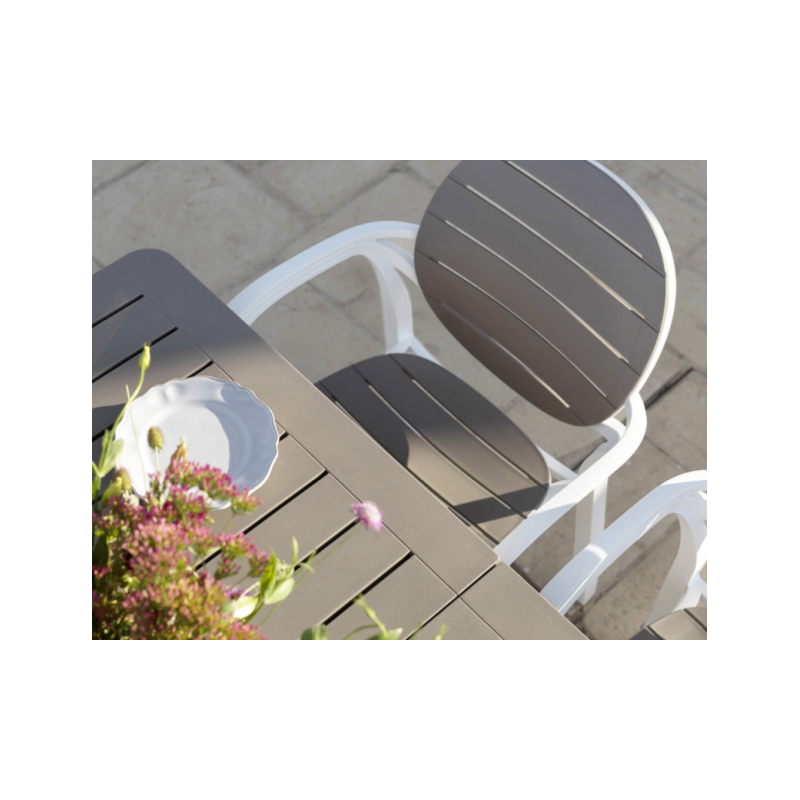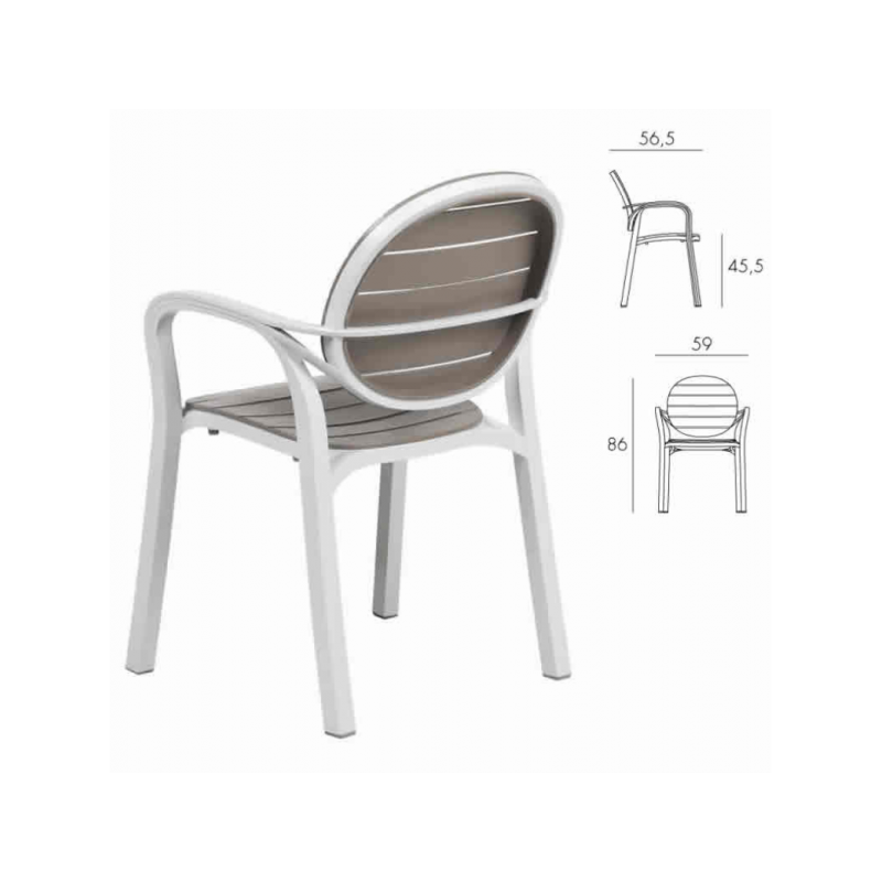 seduta in resina fiberglass dal linguaggio contemporaneo, con seduta e schienale disegnati da ampie doghe. le gambe si diramano in fasci sottili tangenti a seduta e schienale. arreda con gusto e design il tuo set da pranzo, bar e giardino