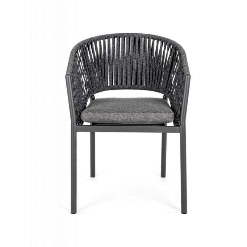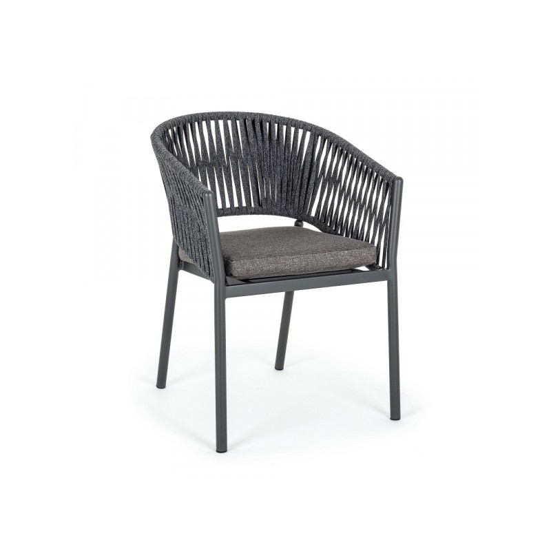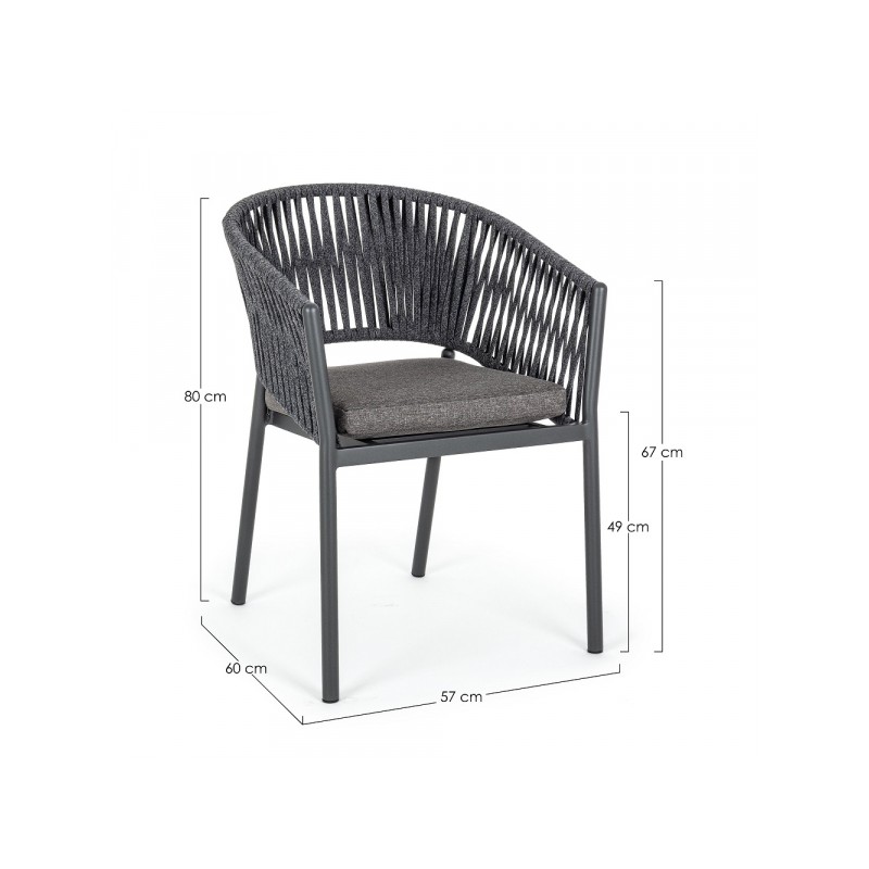 La struttura è in alluminio verniciato color antracite e intreccio con corde color antracite. La seduta con cuscino sfoderabile è in tessuto color grigio.
