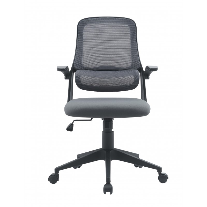 Questa sedia da ufficio è progettata per offrire comfort e funzionalità. La base è realizzata in robusto nylon con ruote in nylon, mentre la seduta è in compensato imbottita con schiuma poliuretanica ad alta densità (25kg/m³) e rivestita in tessuto poliestere 100%. Il supporto lombare è costruito in plastica (PP) e rivestito con tessuto a rete in poliestere 100%, favorendo la traspirazione. I braccioli ribaltabili in plastica (PP) aggiungono versatilità al design. La regolazione dell'altezza è facile grazie al pistone a gas. Questo modello viene fornito da assemblare. Le dimensioni sono: