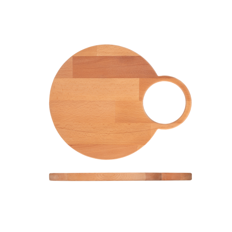 Tagliere sagomato tondo con manico realizzato in legno naturale di faggio