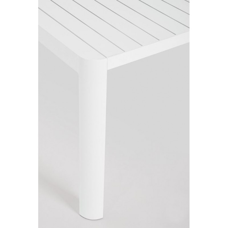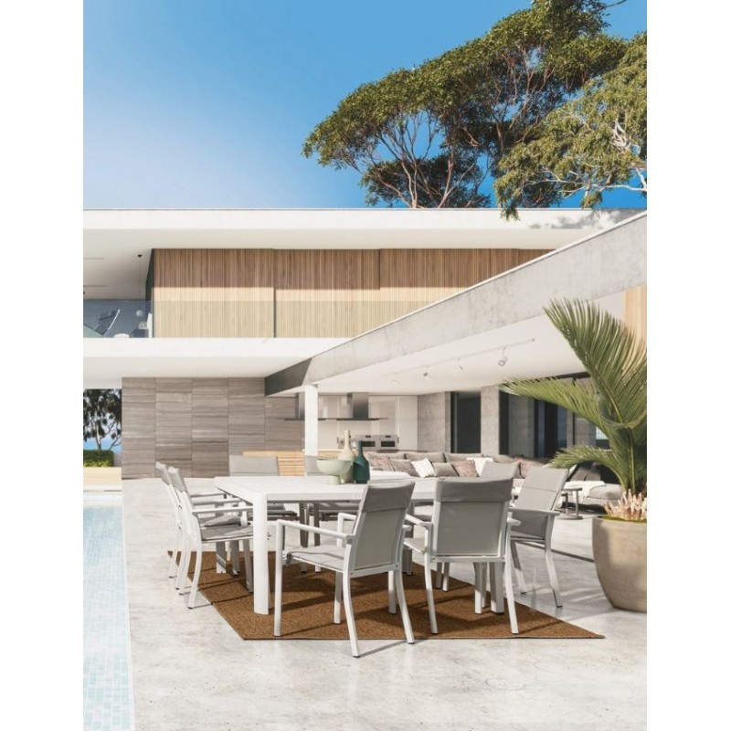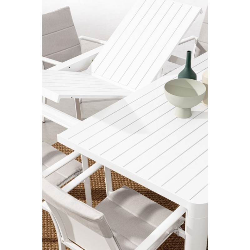 La struttura in alluminio verniciato a polvere è robusta, resistente alle intemperie e di una bellezza senza pari. Il bianco del tavolo si sposa armoniosamente con il verde dello spazio esterno, creando un'unione perfetta tra natura e design