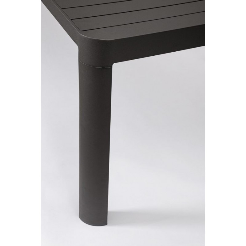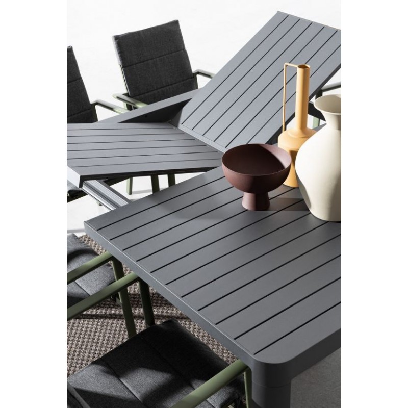 La struttura in alluminio verniciato a polvere è robusta, resistente alle intemperie e di una bellezza senza pari. L'antracite del tavolo si sposa armoniosamente con il verde dello spazio esterno, creando un'unione perfetta tra natura e design