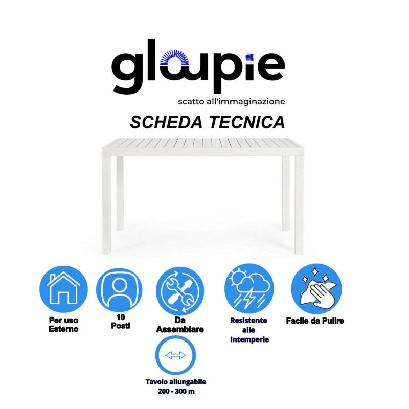- GLOUPIE Tavolo Allungabile 10 Posti Alamos In Alluminio Verniciato A Polvere Epossidica Bianca, 200/300 x 100 x H 75 cm